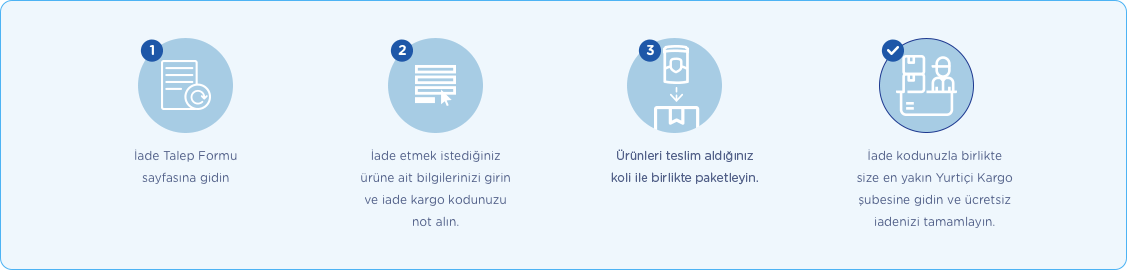 Sitemizde yer alan “İade Talep Formu” nu doldurarak iade talebinizi oluşturabilirsiniz. İade talep formunu doldurduktan sonra çıkan ekranda sizinle iade kodu paylaşılacaktır, lütfen bunu not ediniz. İade kodunuz ile en yakın Yurtiçi Kargo şubesinden ücretsiz bir şekilde iadenizi gerçekleştirebilirsiniz.